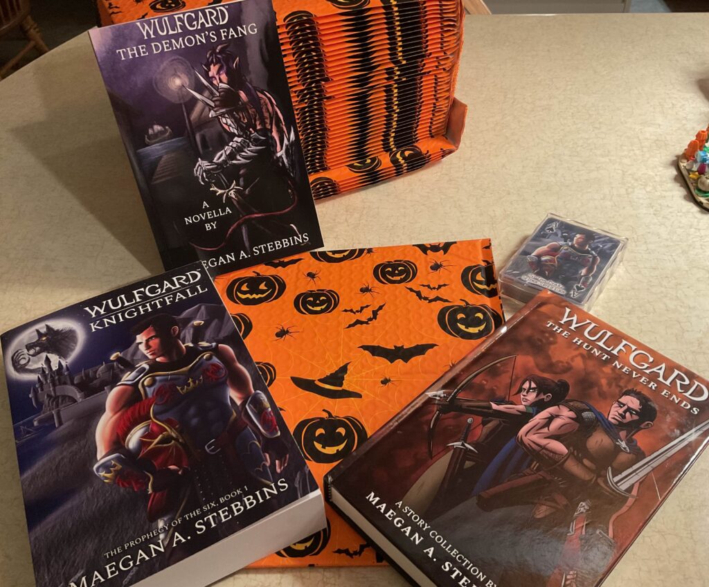 If you order from my website shop anytime this fall, you’ll get your order in a fun Halloween-themed mailer – if the order can fit! Not all my hardcovers can fit (hardcover Knightfall, for example), and I’m not sure paperback Knightfall will fit, either, but hey, a lot of orders will.