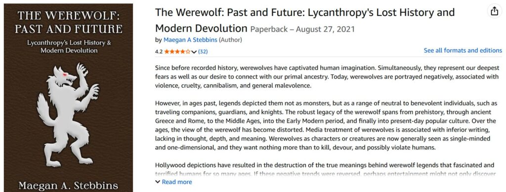 My bestselling book by a wide margin is my thesis, The Werewolf: Past and Future: Lycanthropy’s Lost History and Modern Devolution. This is both because it is an often-cited work on a niche subject and because it is one of my earliest-published books, but it’s also because it has so many reviews and ratings on Amazon!